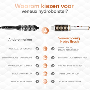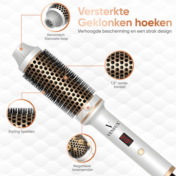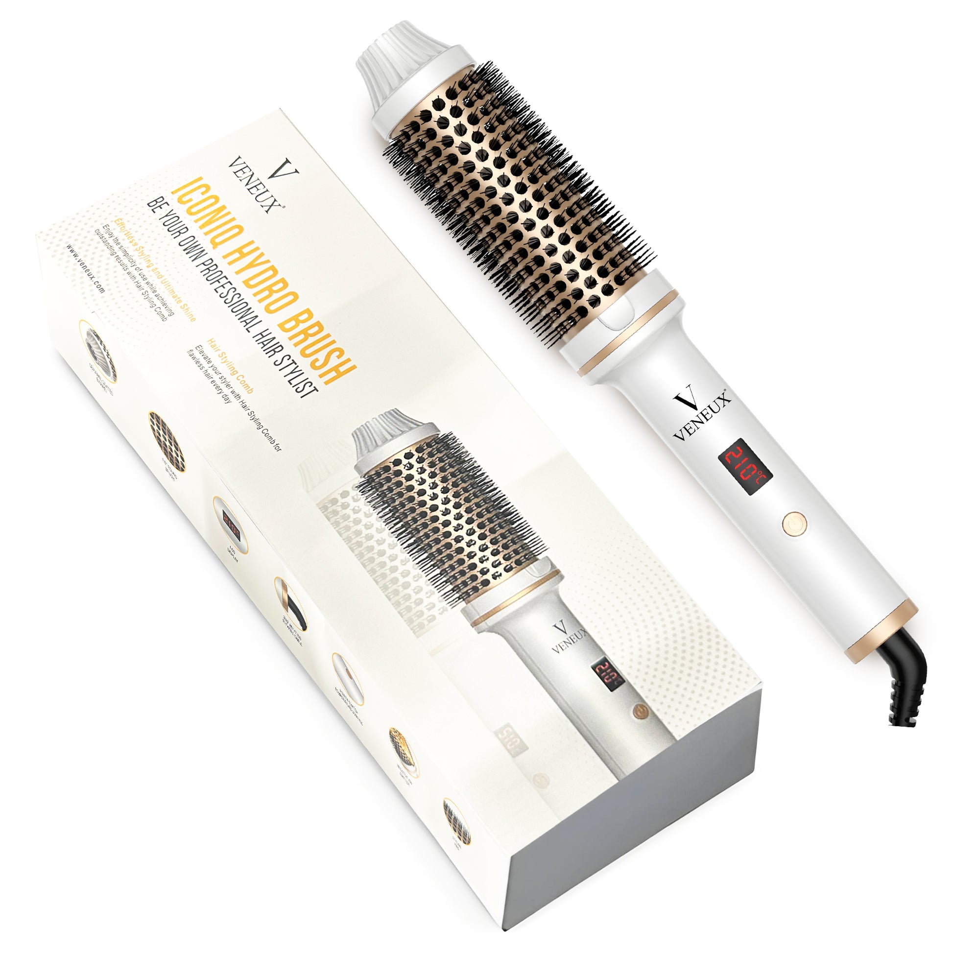 De Veneux® Hair Brush combineert warmte en ionentechnologie om je haar moeiteloos glad, glanzend en pluisvrij te maken. Met vijf temperatuurinstellingen (120°C-230°C) kun je de warmte aanpassen aan jouw haartype.